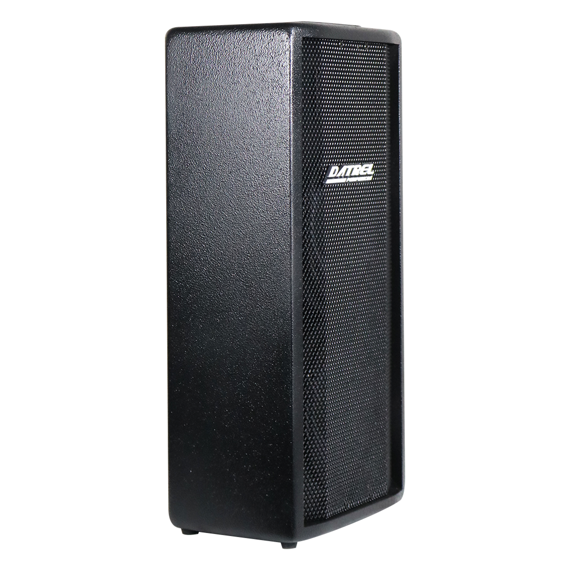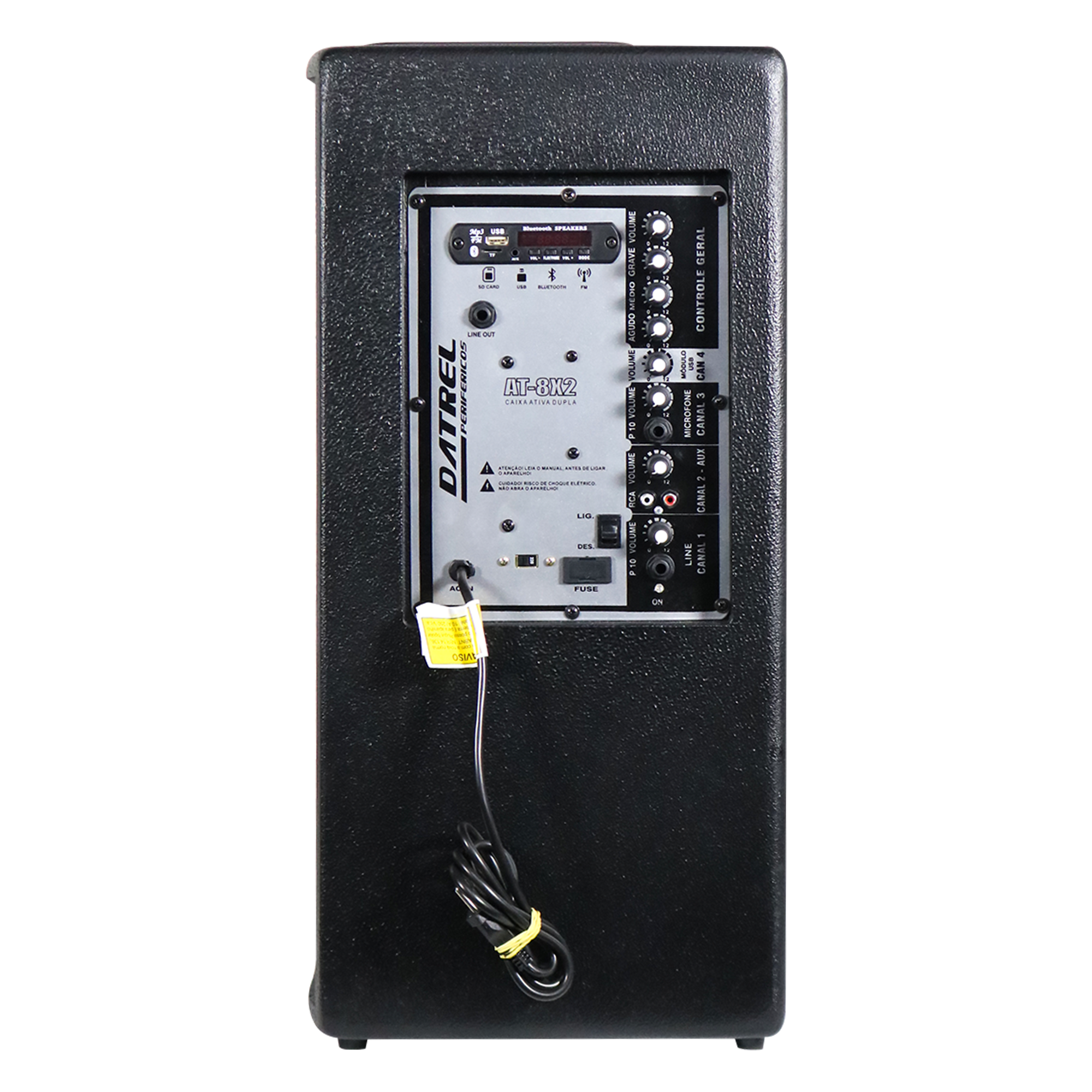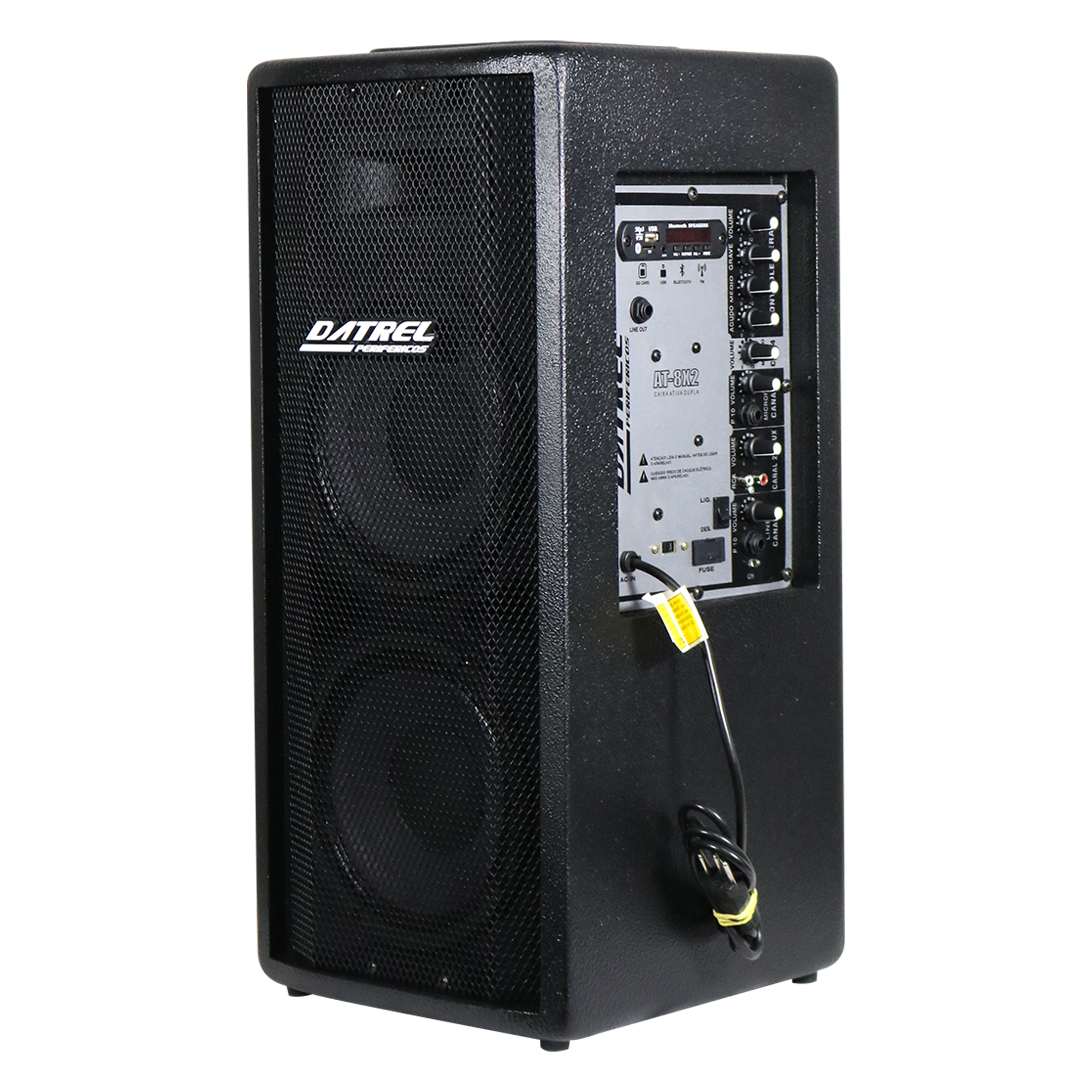 A Caixa Ativa dupla AT-8X2 DATREL conta com duplo woofer de 8 polegadas e driver tweeter, com 150W de potência e módulo multimídia (conexão via Bluetooth, entrada para Pendrive, Cartões SD e Rádio FM), tudo controlado por controle remoto de autonomia e praticidade em instalações onde não se permite acesso ao módulo multimídia, como, por exemplo, pedestais de parede. A AT-8X2 conta com entradas tipo P10 e RCA que garantem conectividade com equipamentos como DVD, PC, KARAOKÊ e microfone (com controle independente) excelente para barzinhos, área de lazer, entre outros eventos. A AT-8X2 conta com alça superior que oferece um conforto na hora do transporte, seu gabinete permite o uso na horizontal e na vertical possibilitando o uso como monitor de palco.