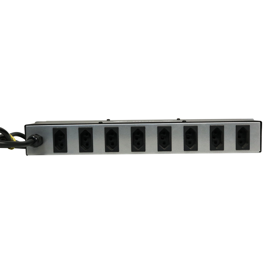 A Régua conta com 8 tomadas de saída e 1 tomada de serviço, permitindo que você conecte vários dispositivos simultaneamente. As tomadas de saída possuem capacidade de até 20A cada e estão dispostas na vertical, o que facilita a organização dos cabos e evita emaranhados.